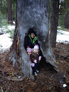 Playing in a hollow tree with cousins Quin and Lia.
