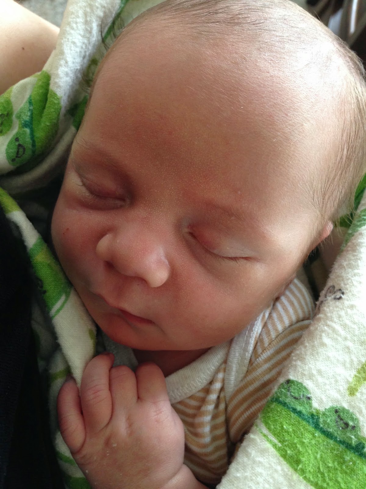 Reid has been growing a lot. He had a few extra sleepy days because of his cold, I think, and a 99.2 degree fever the other night. Today he has been awake a lot, so hopefully he'll sleep well tonight. I'm pretty tired, but I think he's on the mend. His umbilical cord finally fell off yesterday. I went to change his diaper and it wasn't there, then I found it on the changing pad. So that's nice that we don't have to clean it anymore. He's fitting really well in the 0-3 month clothes already. Goodbye newborn things.